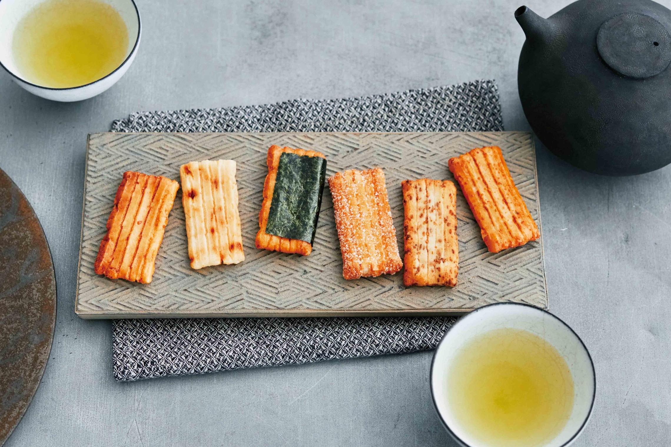 ざらめ、のり巻き、さくら海老、ゆず七味、金ごま、しょうゆの