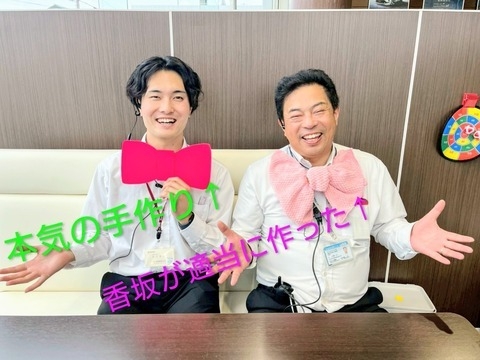 苦労して作った自慢のピンク蝶ネクタイのニシ摩呂と、香坂適当手作り蝶ネクタイのイト摩呂で、はいっチーズ🤗🤗