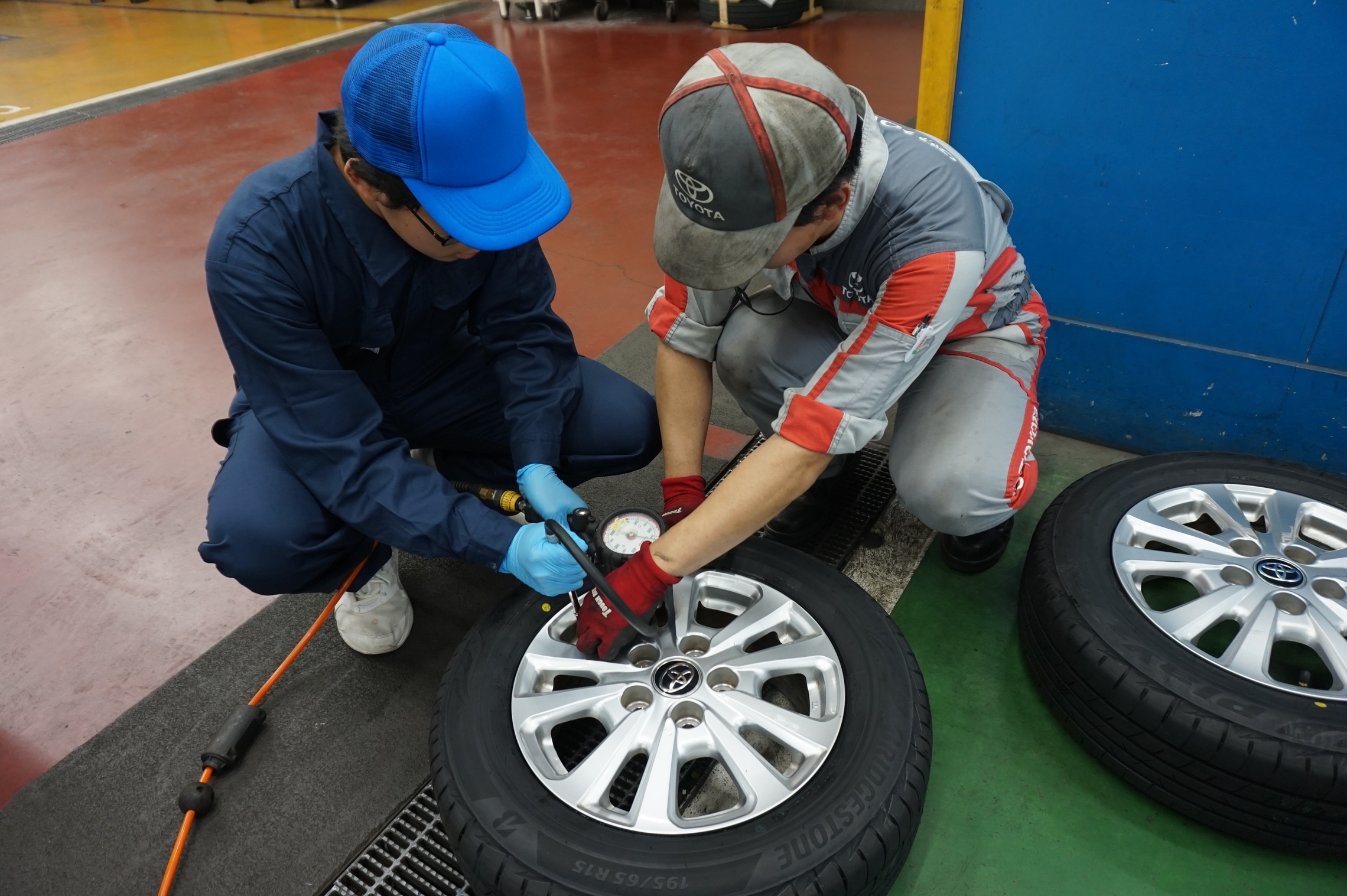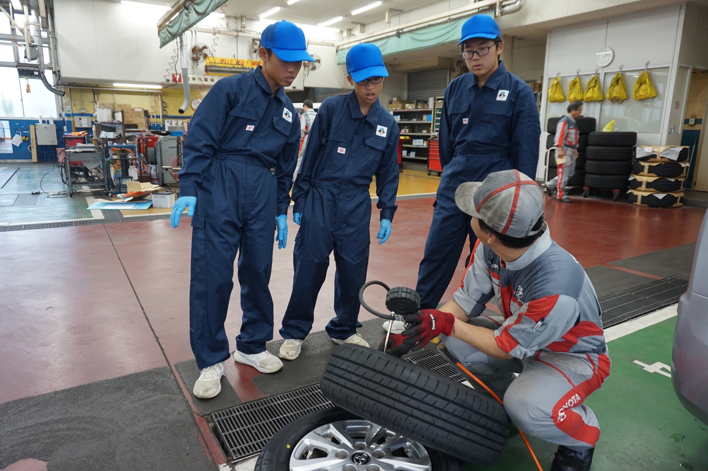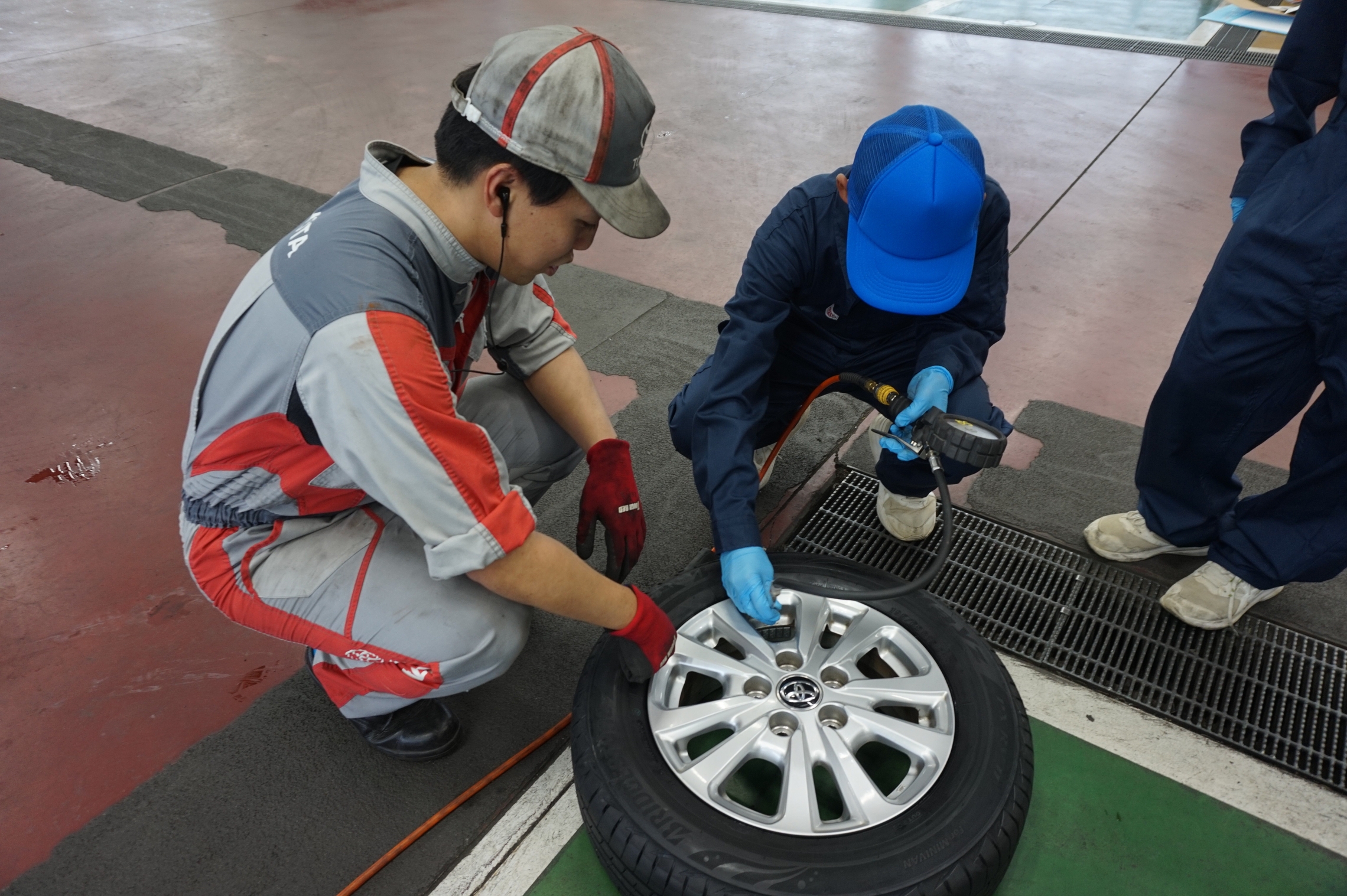 先輩たちと一緒にタイヤの取付や空気圧のチェックを