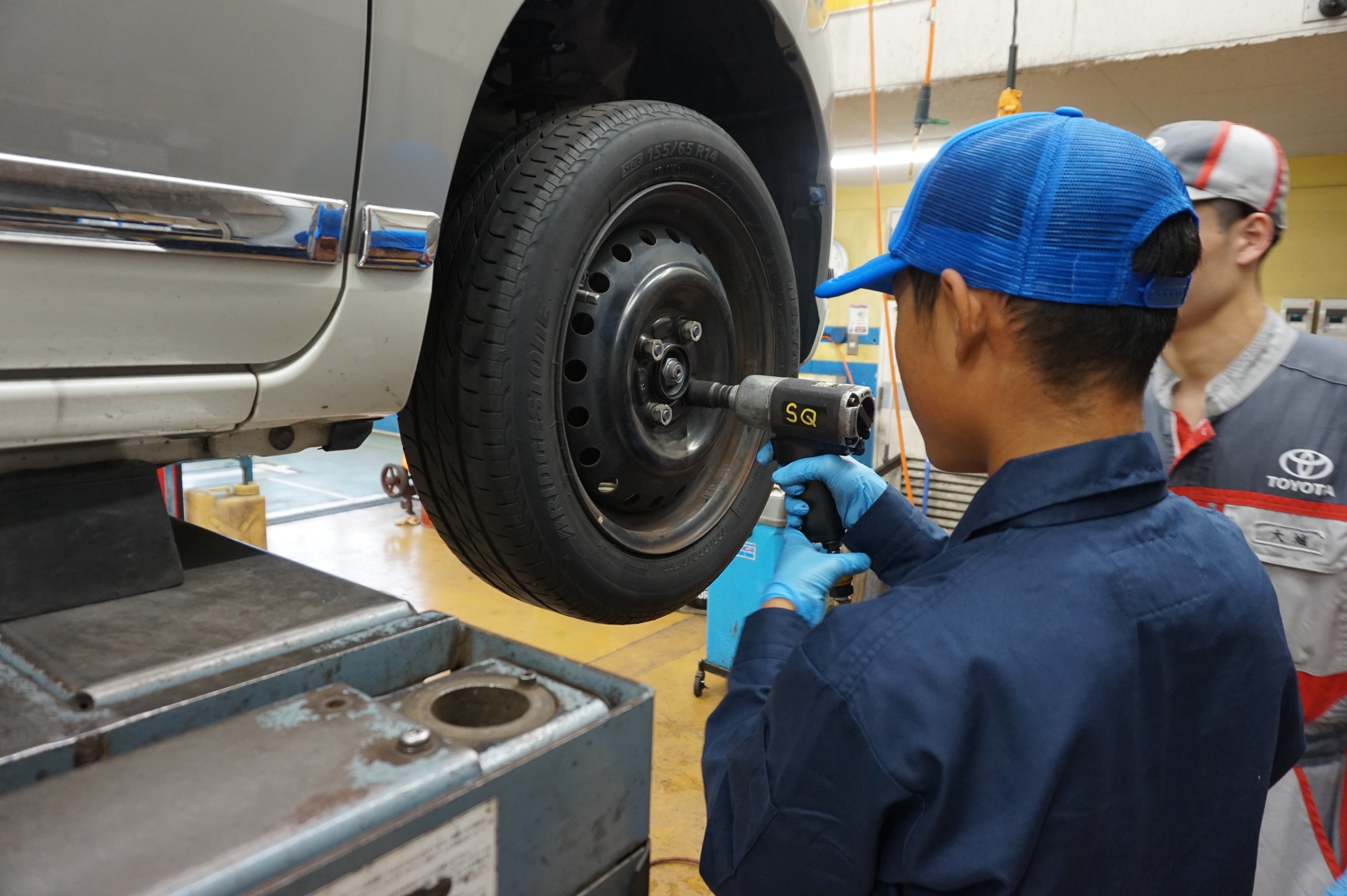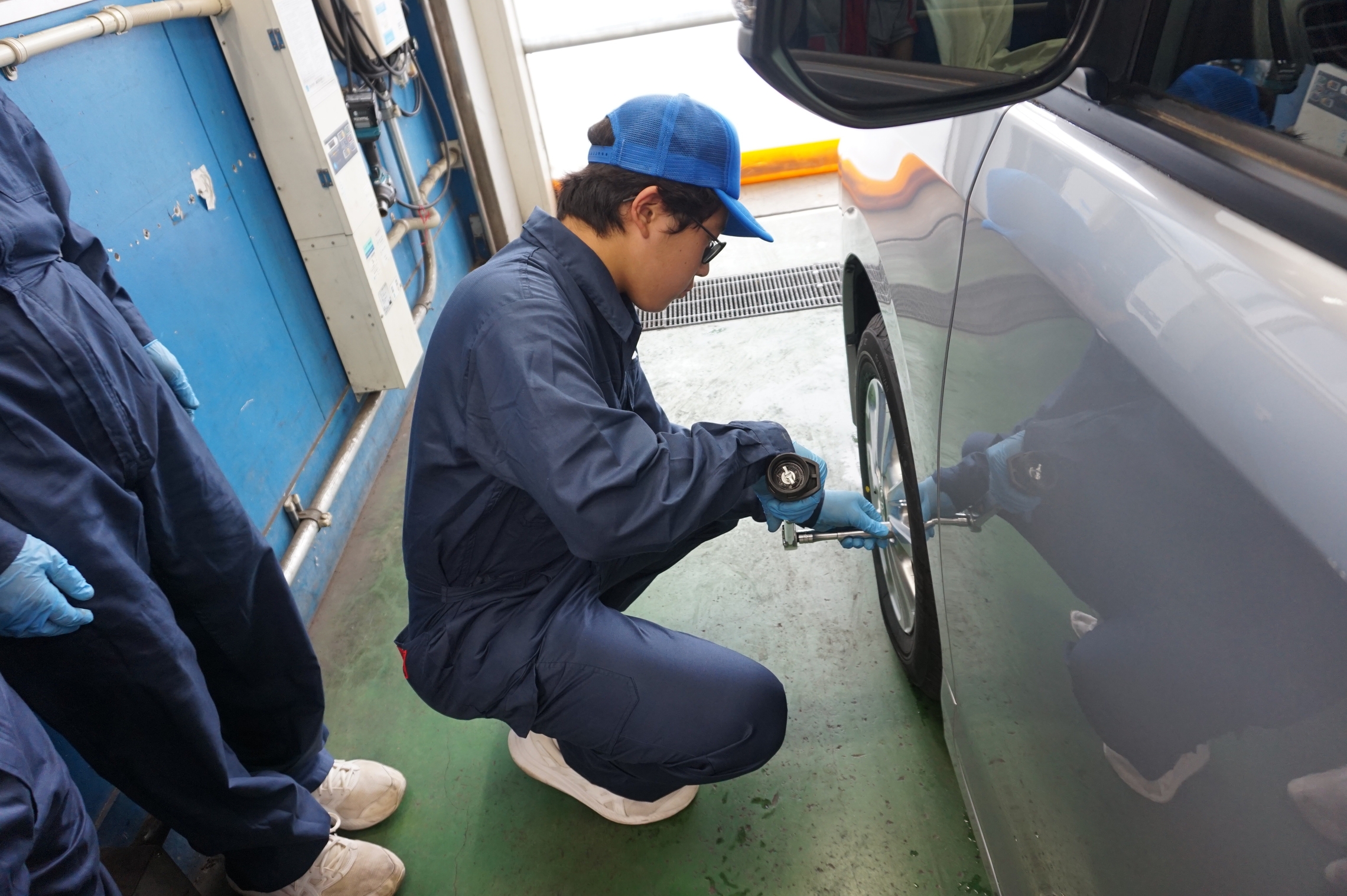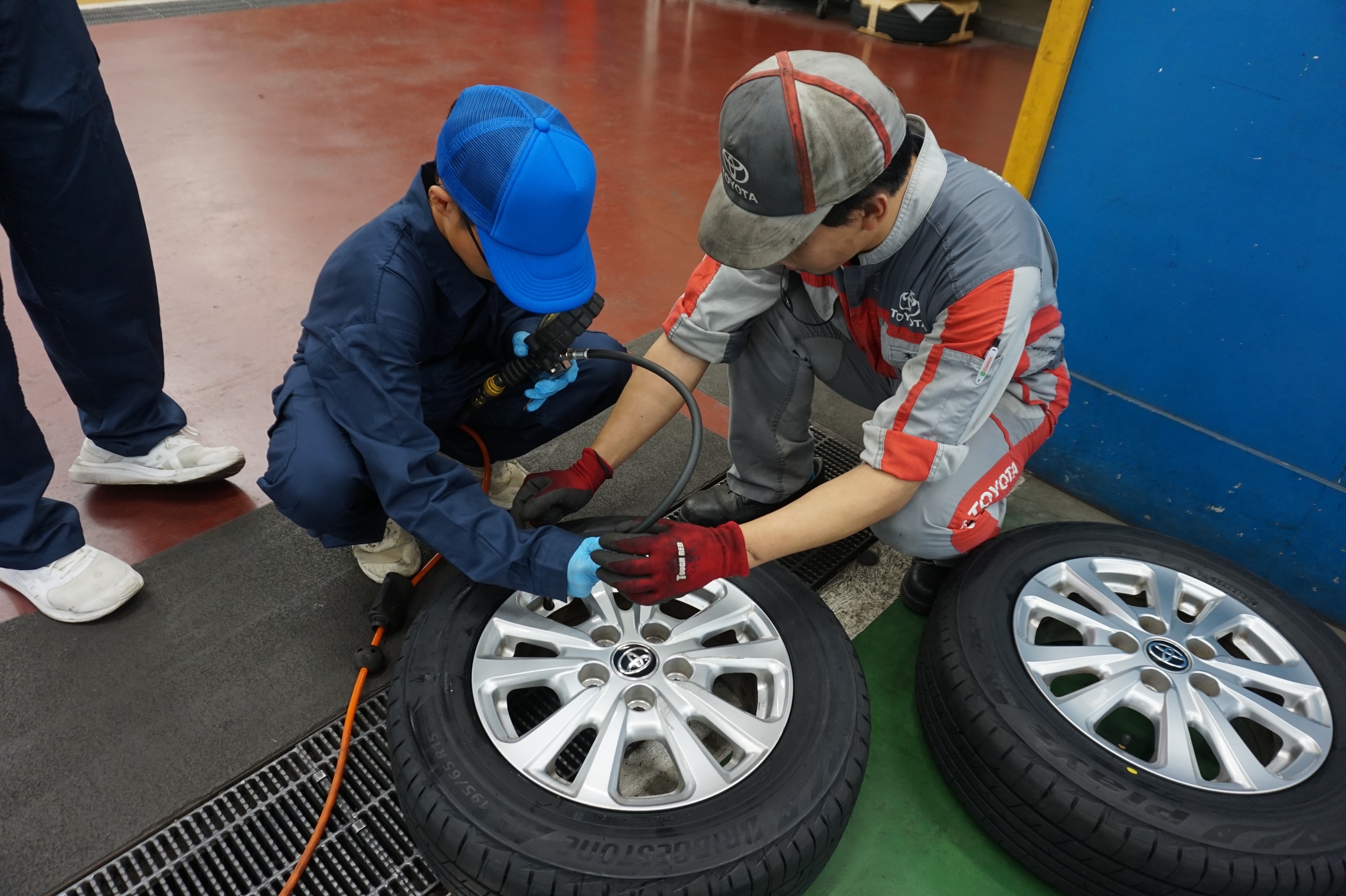 先輩たちと一緒にタイヤの取付や空気圧のチェックを