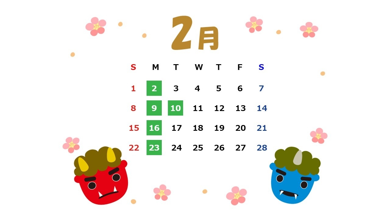 2月の営業日をお知らせいたします。