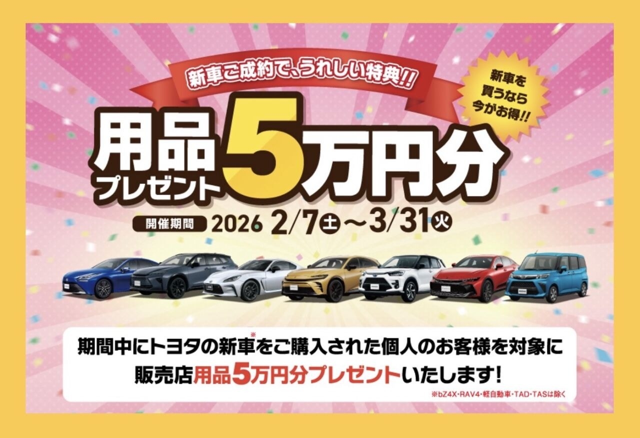 新車をご購入していただいたお客様を対象に用品5万円分プレゼントいたします🎁