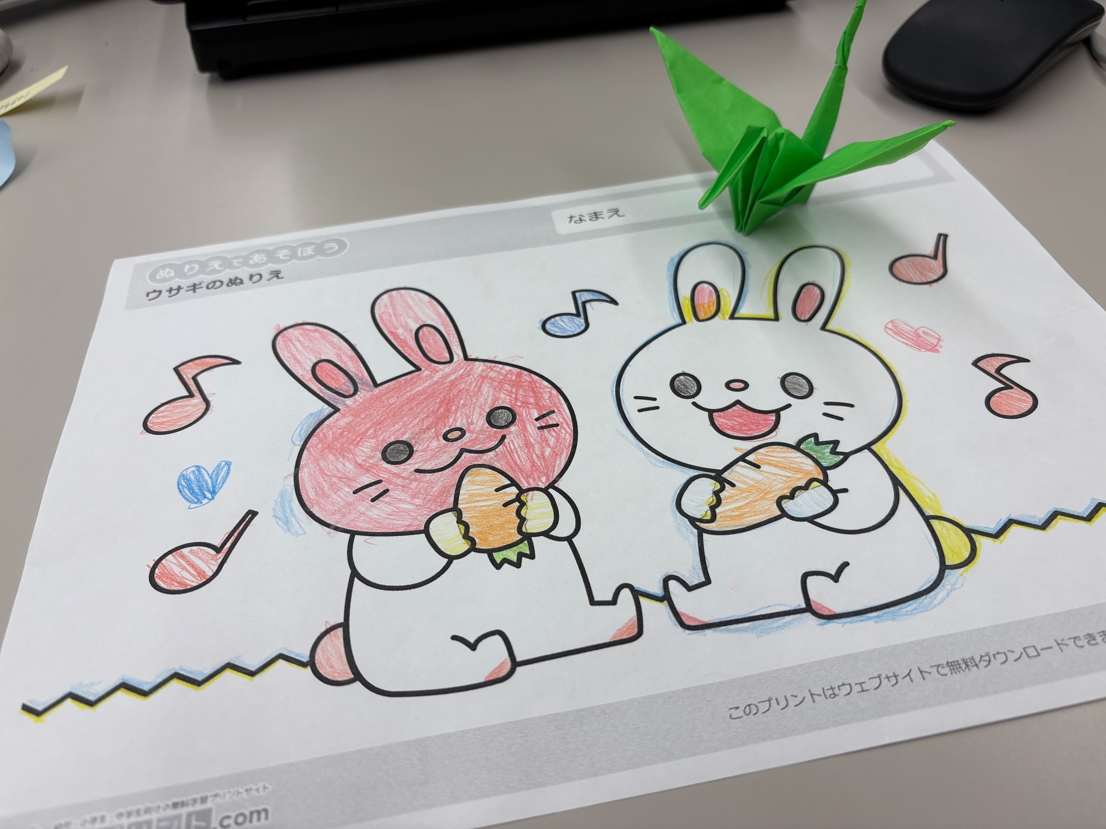 《いただいた塗り絵と折り鶴》
