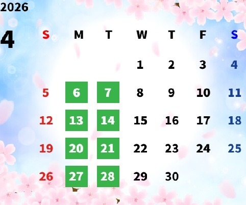 4月は通常とは違い、月曜・火曜連休になります。