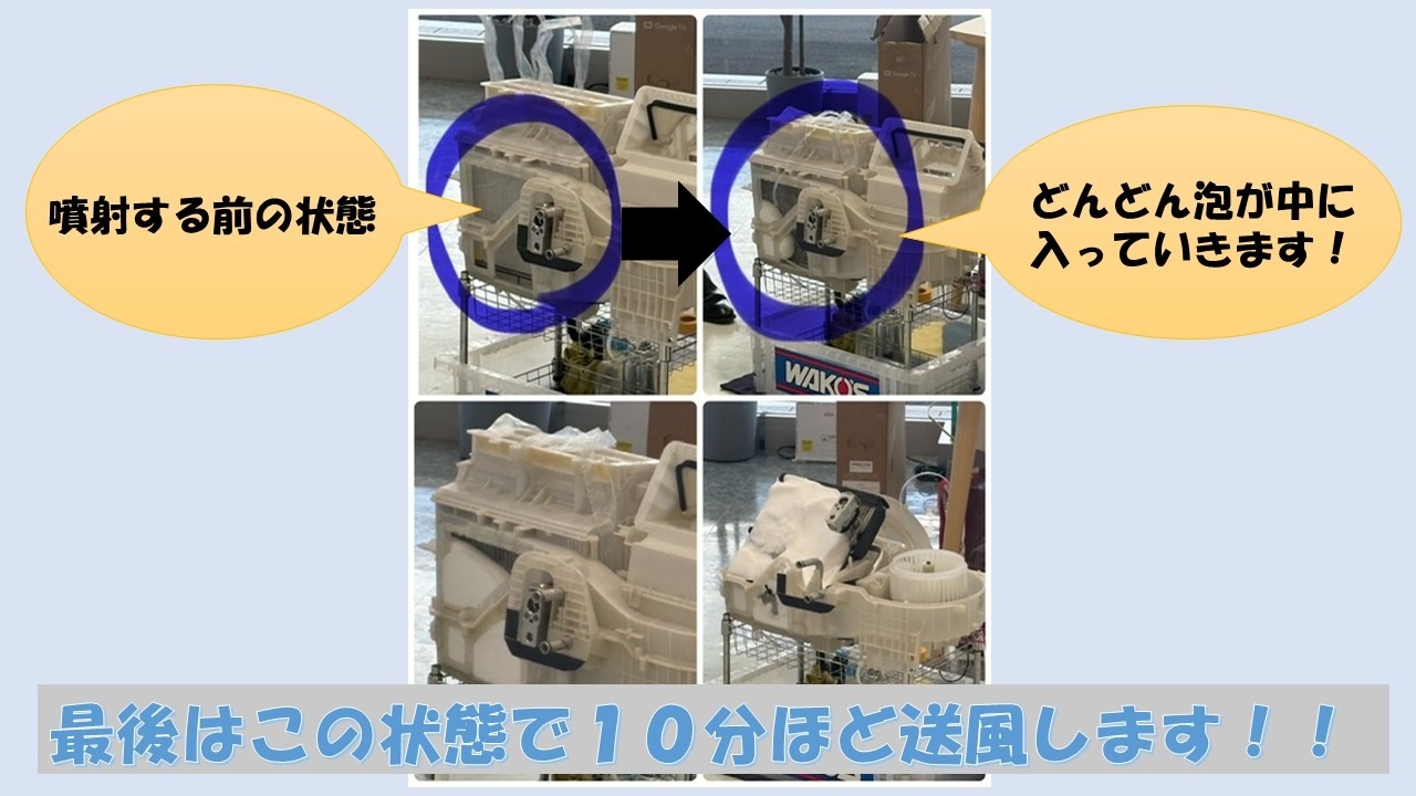 こちらはエアコンの内部にあるエバポレーターに直接泡を密着させることで