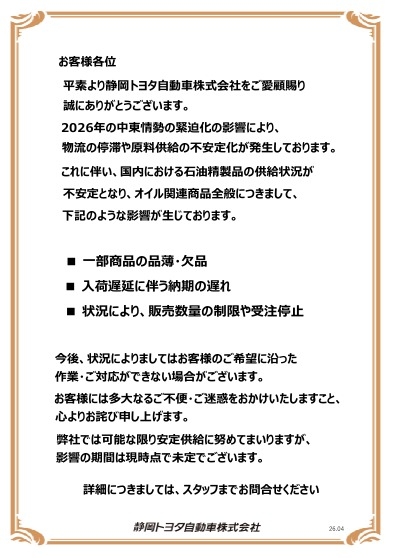 昨今の中東の情勢により、オイル関係商品全般の供給状況が不安定となり、